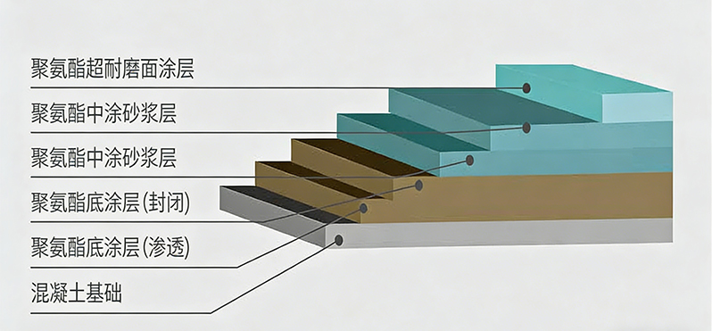聚氨酯地坪涂料作为一种新型的材料,弥补了环氧树脂地坪涂料的一些不足之处,正得到越来越多的应用;未来主要是替代环氧地坪涂料的新一代地坪材料,比环氧树脂材料更具耐磨性、柔韧性、施工便捷,地坪施工2小时后即可达到使用要求,完全改变了企业地坪翻新所顾虑的时间问题。 施工工艺 · 基础处理 · 无溶剂聚氨酯底漆层 · 无溶剂聚氨酯加砂层 · 无溶剂聚氨酯加砂层 · 脂肪族聚氨酯超耐磨面层 · 固化养护